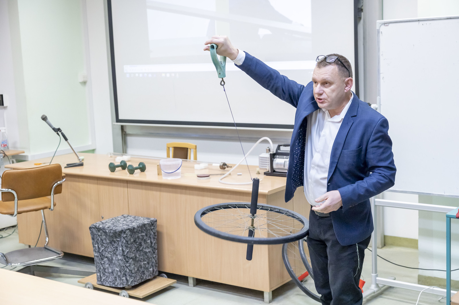 Innowacja ta była możliwa, ponieważ od obecnego roku akademickiego większość zajęć wykładowych z fizyki realizowana jest w jednej sali wykładowej (S2) przygotowanej do prowadzenia demonstracji. Mamy nadzieję, że tego typu zajęcia na stałe zagoszczą w murach Politechniki Rzeszowskiej.
