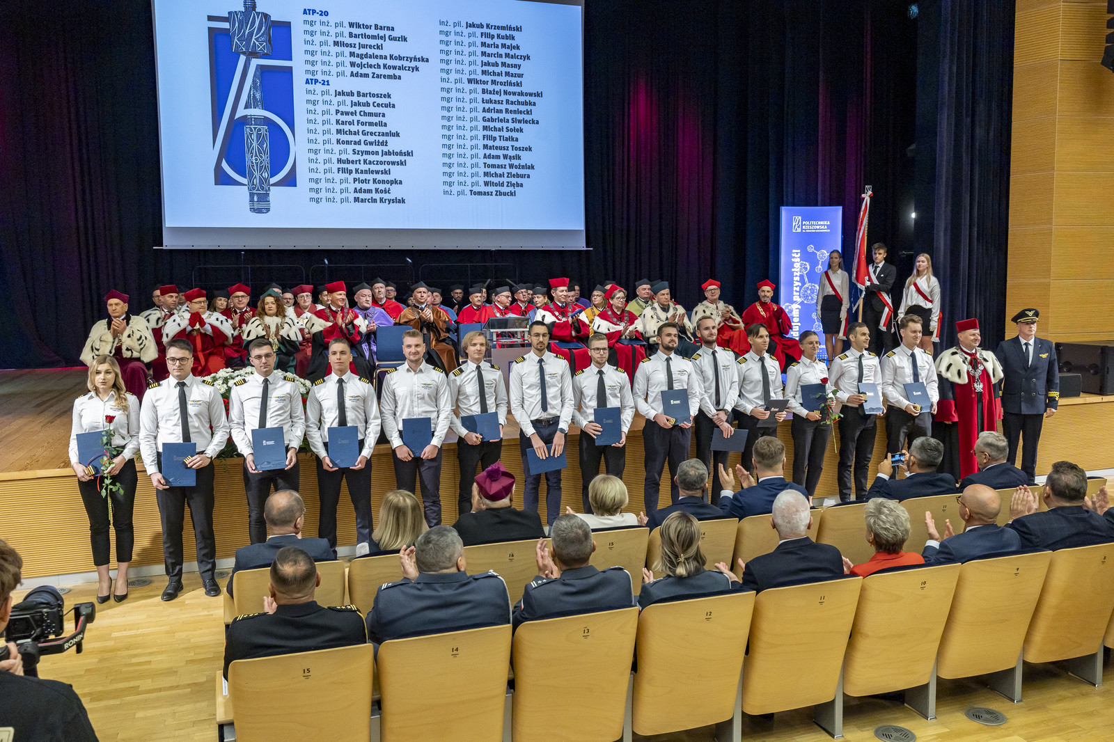 Politechnika Rzeszowska od 50 lat kształci pilotów lotnictwa cywilnego. W Ośrodku Kształcenia Lotniczego do tej pory wykształciliśmy 1261 pilotów, którzy pracują w liniach lotniczych na całym świecie. Na uroczystości kolejna grupa pilotów otrzymała certyfikaty ukończenia szkolenia do licencji pilota komunikacyjnego. Certyfikaty i pagony pilotom wręczyli JM Rektor i dyrektor Ośrodka Kształcenia Lotniczego mgr inż. pil. Tomasz Nowosielski. Miłym akcentem była informacja o nadaniu wyróżnienia prymusowi wśród lotników mgr. inż. Julii Zawidowicz przez Światowe Stowarzyszenie Lotników Polskich. Akt wyróżnienia wręczył prof. Marek Grzegorzewski.