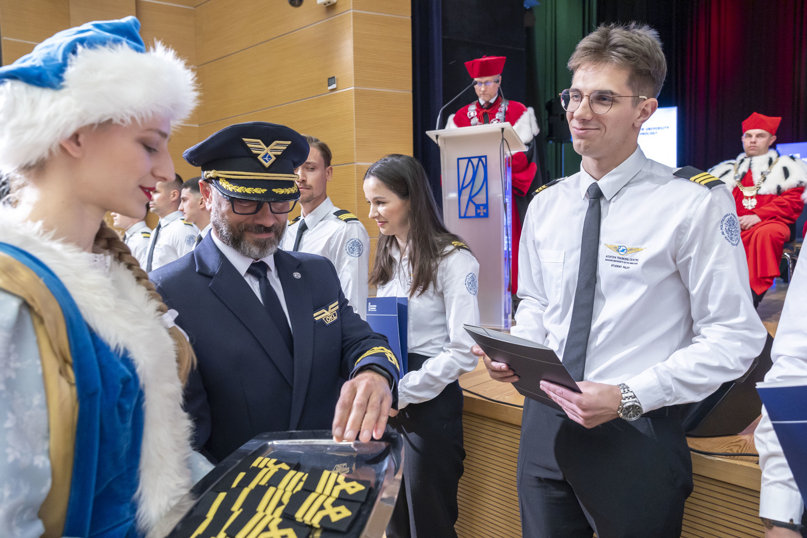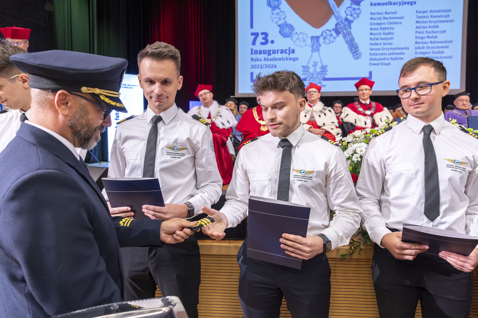Po odśpiewaniu przez Chór Akademicki Politechniki Rzeszowskiej Gaudeamus Igitur zostały wręczone certyfikaty ukończenia szkolenia do licencji pilota komunikacyjnego. Tę część uroczystości poprowadził prorektor ds. rozwoju i współpracy z otoczeniem prof. dr hab. inż. Jarosław Sęp. W tym roku 23 studentów kierunku lotnictwo i kosmonautyka, specjalności „pilotaż” zakończyło szkolenie i uzyskało certyfikat. Certyfikaty i pagony pilotom wręczyli JM Rektor i dyrektor Ośrodka Kształcenia Lotniczego dr inż. Arkadiusz Rzucidło.
